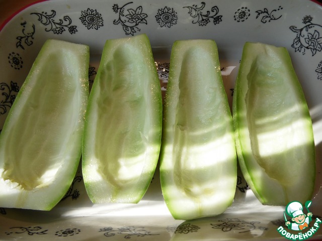 Кабачки разрезать напополам, с помощью ложки сделать лодочки, вынув мякоть, посолить, поперчить, выложить в смазанную растительным маслом форму для запекания.