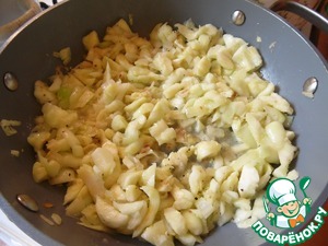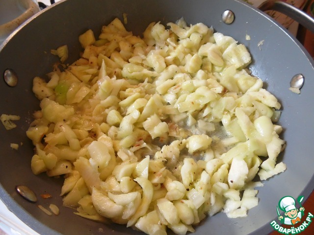 К луку и чесноку добавить нарезанную кубиками мякоть кабачка, обжарить 4-5 минут.