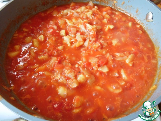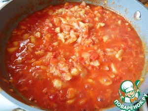 Томаты в собственном соку измельчить блендером, залить полученную смесь, тушить 5 минут.
