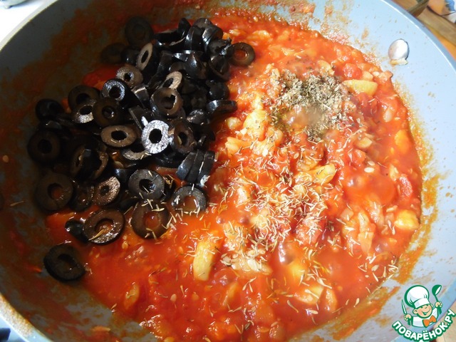 Маслины нарезать кольцами, выложить их в соус, посолить, поперчить, добавить травы, варить еще 3-4 минуты.