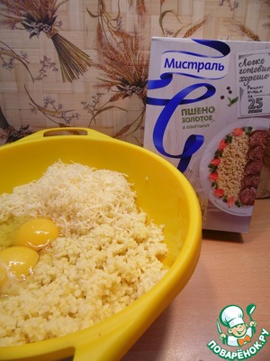 В пшено добавить 2 яйца, натертый на средней терке сыр, хорошо перемешать. -