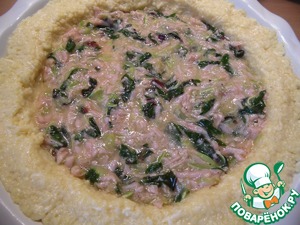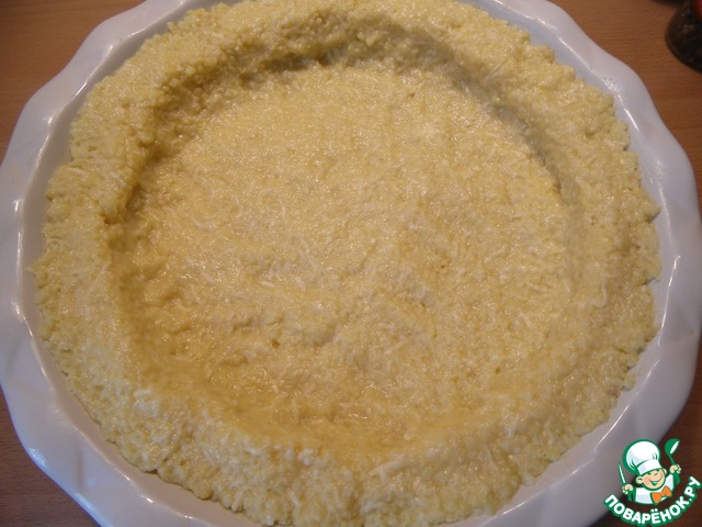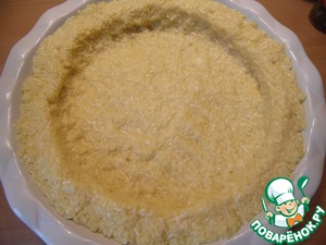 Круглую форму для запекания (25 см) смазать сливочным маслом, выложить в нее пшенное тесто, сделав бортики.