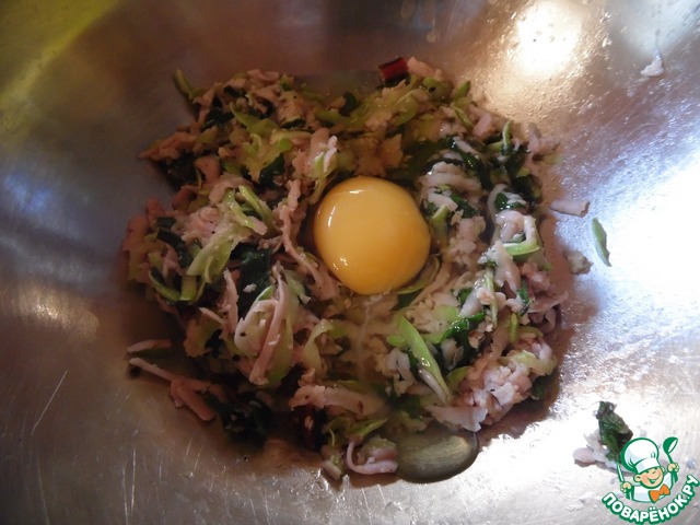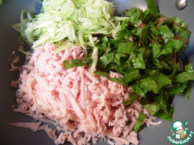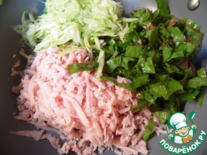 Кабачок и ветчину натереть на крупной терке, мангольд мелко нашинковать. Подготовленные продукты обжарить на растительном масле 4 минуты, остудить.