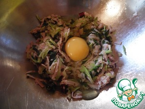 В полученную смесь добавить яйцо, соль и перец, хорошо перемешать.