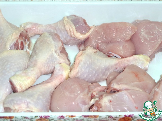 Если курица целая, разрубить на порционные куски.