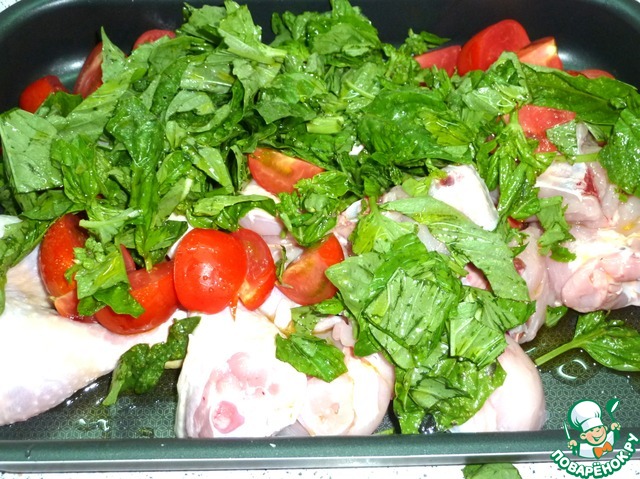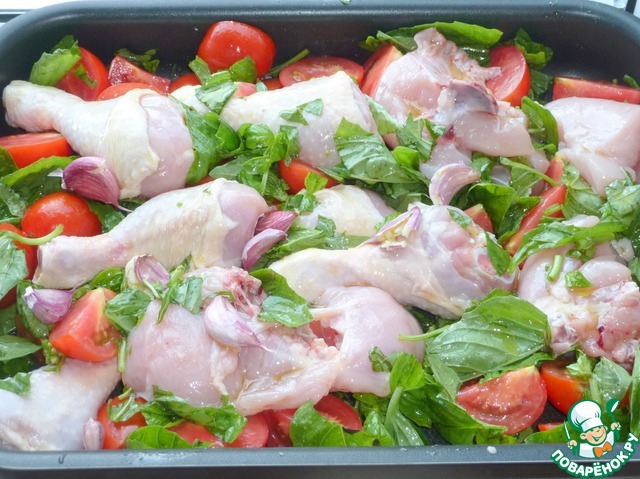 Добавить к кускам курицы базилик (не жалейте базилик, побольше его-побольше!!!), чеснок, помидоры.