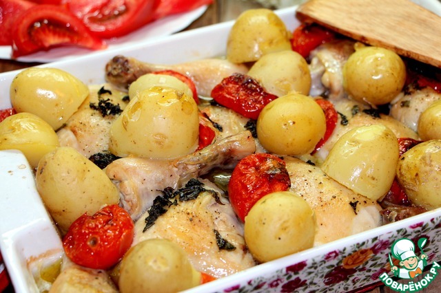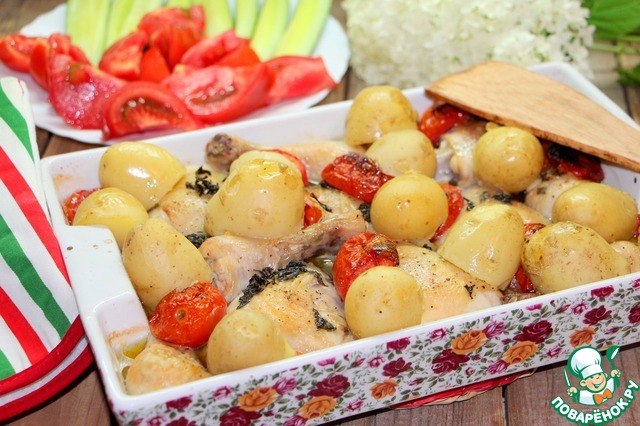 В середине процесса куски курицы перевернуть и добавить картошку, отваренную заранее.