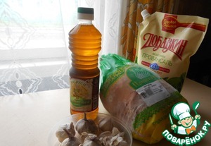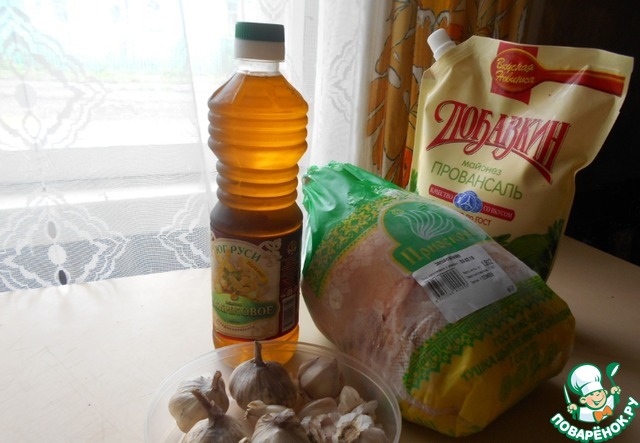 Курицу мы делаем кусочками. Чистим чеснок и пропускаем через пресс, смешиваем с майонезом, рыжиковым маслом, и немного солим.