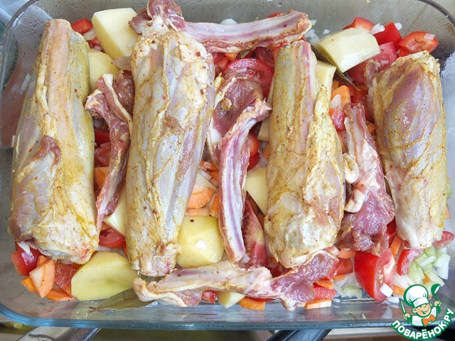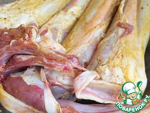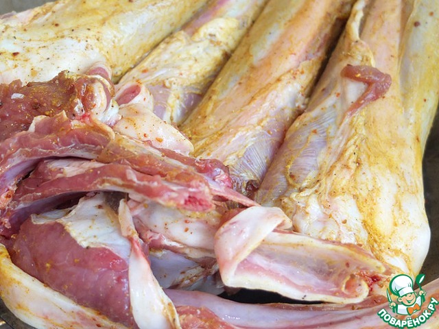 Бараньи голяшки и анрекот приправить с вечера солью, черным перцем и молотой куркумой