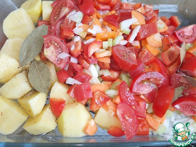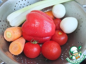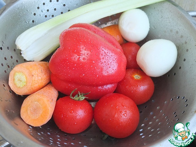 Лук нарезаем мелко. Томаты на 4-6 частей. Картофель крупно. Сельдерей и морковь - как нравится.