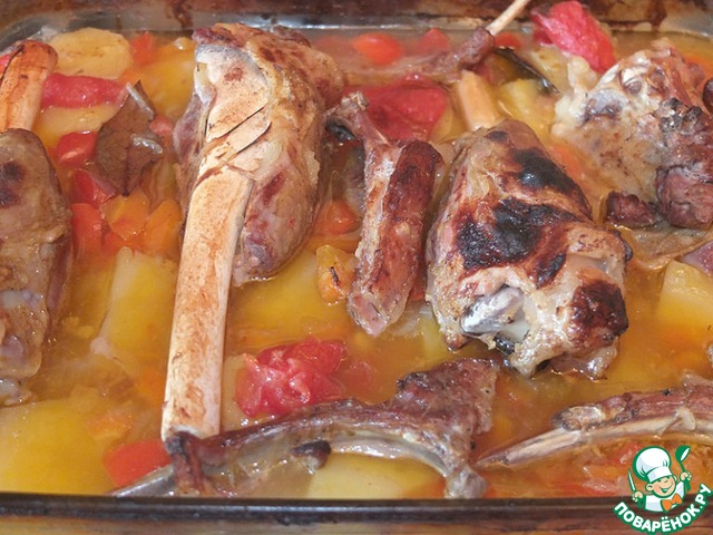 Накрыть плотно фольгой и отправить в разогретую духовку. Как только начнет закипать, снизить нагрев, чтобы были единичные пузырьки, и оставить томиться часа на два. -