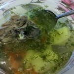Шурпу обычно подают раздельно: бульон в касу (пиалу), а все содержимое выкладывают на большое блюдо, да на центр стола. Мне же нравится вот такая подача: все вместе, только мясо, рассыпающееся на волокна, с краю, да приправить обильно свежемолотым черным перцем.