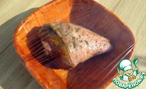 Сделайте в индейке глубокие проколы кончиком ножа и нашпигуйте зубчиками чеснока. Если зубчики большие, их можно порезать. Натрите голень специями с солью и обмажьте смесью 1 ст. л. мёда и 1 ст. л. масла. Оберните пищевой пленкой и оставьте мариноваться в прохладном месте на 3-4 часа. -