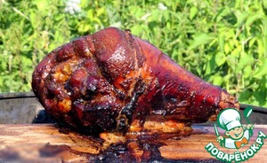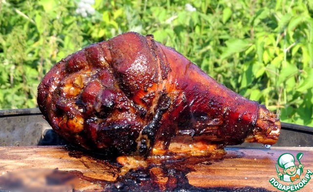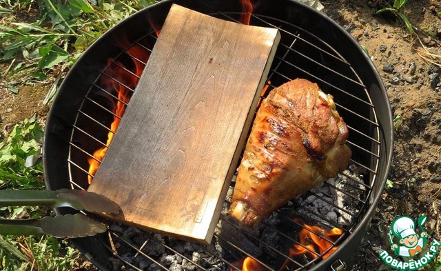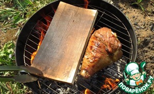 После того как гриль-доска подсушилась с лицевой стороны переверните её и положите сверху поджаренную голень и запекайте в течении часа, следя за жаром углей и предотвращая возгорание гриль-доски с помощью распылителя с водой или бутылки с дыркой в крышке (доска должна тлеть, а не гореть!).