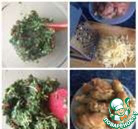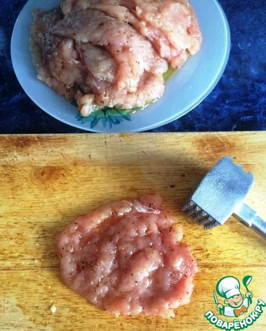 • Нарезать куриное филе на порционные кусочки, отбить, посолить, поперчить по вкусу, смазать немного оливковым маслом. Сложить мясо и оставить в сторонку, пока будем готовить начинку.