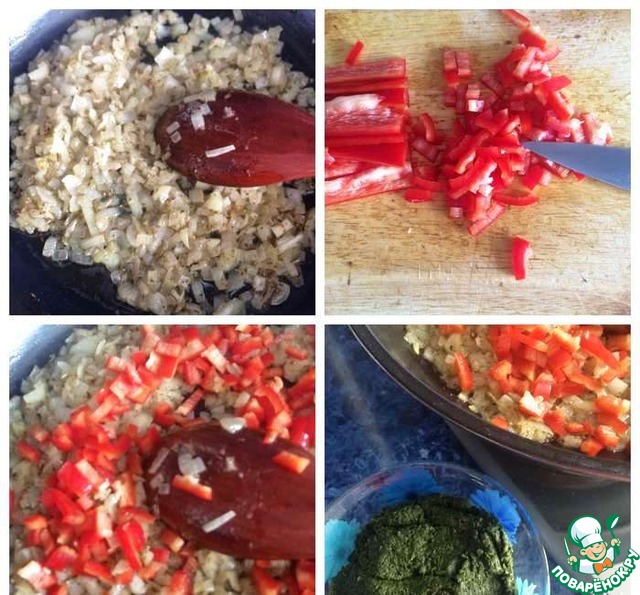 • Нарезаем головку лука и несколько долек чеснока. На сковородку со сливочным маслом выкладываем лук и чеснок и обжариваем до мягкости. Затем к луку добавляем нарезанный болгарский перец и шпинат (свежий или размороженный). Томим на медленном огне минут 5.