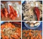 • 2 головки лука нарезаем полукольцами, 2 морковки режем кружочками. На сковородку с оливковым маслом выкладываем лук, немного обжариваем, затем добавляем нарезанную морковь и тушим до мягкости. Готовый лук с морковью выкладываем на дно формы, в которой будем выпекать рулетики.