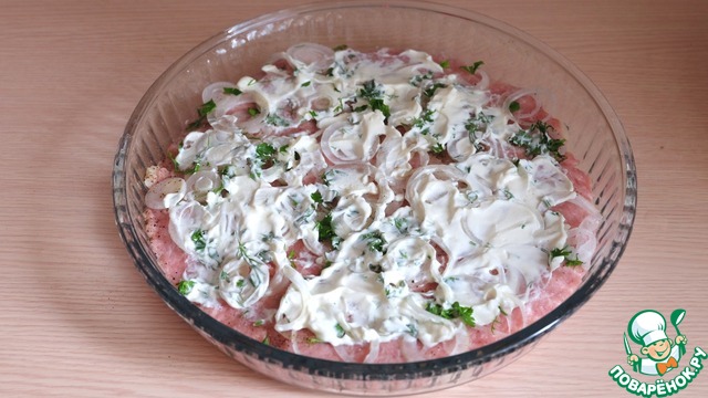 - Сметана (При ложки для смазывания слоя фарша и лука, три ложки для приготовления заливки.) — 6 ст. л.
