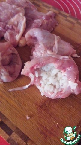 Куриные голени (без кости) обмазать специями (у меня адыгейская соль) и наполнить отваренным рисом. Края голени можно закрепить зубочисткой.