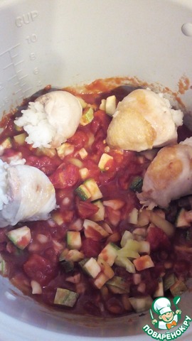 Выложить овощи в чашу мультиварки. Приправить по вкусу. Можно опционально добавить томатный сок (это по желанию).