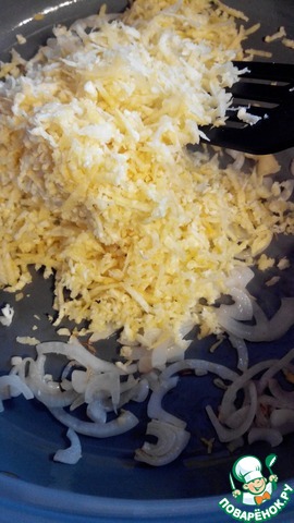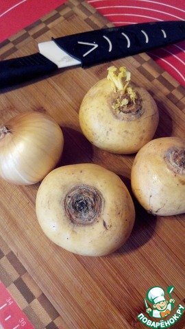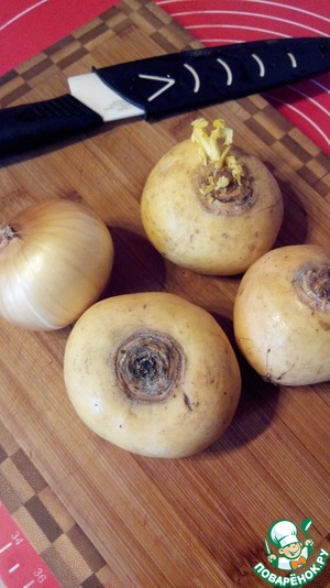 • Обжариваем лук на растительном масле до золотистого цвета и добавляем репу. Помешивая, жарим на медленном огне минут 5-7