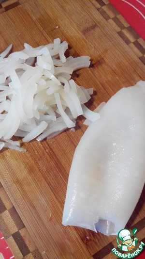 • Очищенные кальмары окунаем в кипящую воду на минуту. Нарезаем соломкой.