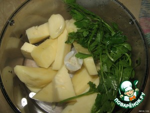 В блендере измельчаем 1/3 брынзы, немного зелени и чеснок. -