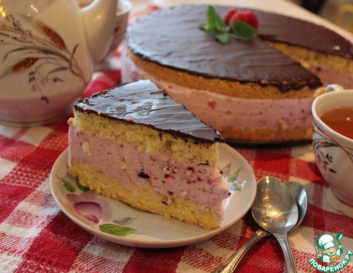 На дно разъемной формы кладем часть бисквита, быстренько заливаем суфле и накрываем второй частью.