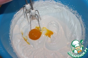 Когда белки взобьются в белую пышную массу, по одному добавлять желтки, хорошо взбивая миксером после каждого.