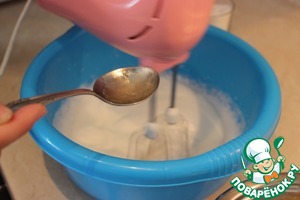 Белки взбиваем с лимонной кислотой постепенно добавляя по столовой ложке сахарной пудры и желатина, чередуя между собой.