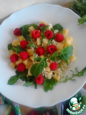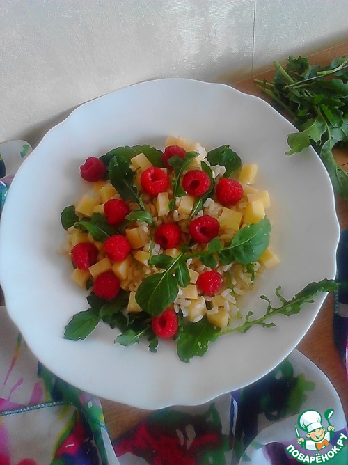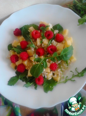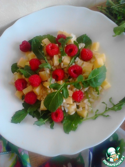 Быстрый летний салат с рисом, сыром, рукколой и малиной.
