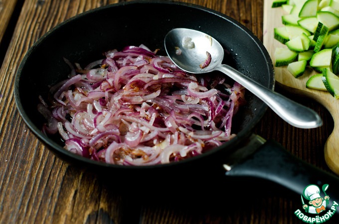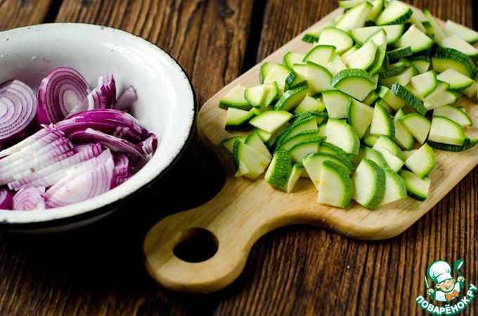 Лук нарезать полукольцами, а цуккини четвертинками.