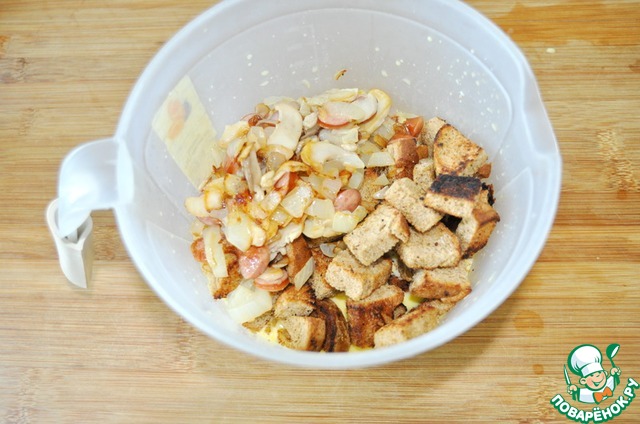 Добавляем в омлетную смесь подсушенный хлеб, зажарку из грибов.