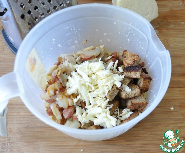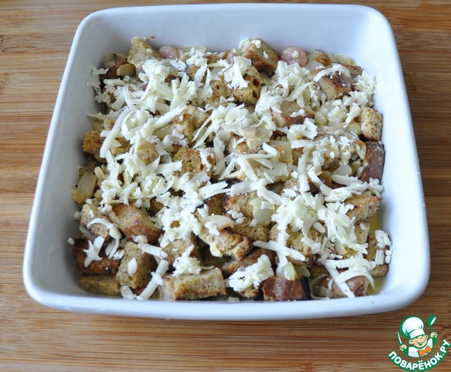 Перелаживаем смесь в удобную форму, посыпаем сверху оставшимся сыром, ставим в духовку (она у нас нагрета, там сушился хлеб).