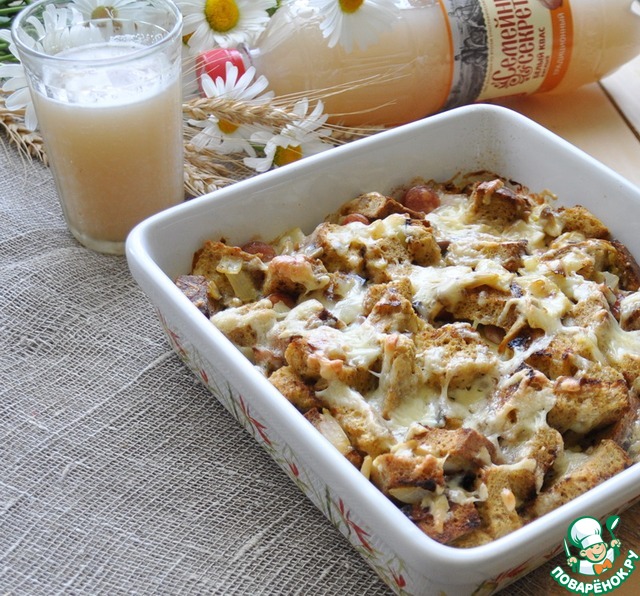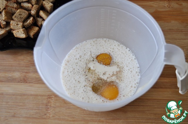 Бабушка просто резала хлеб, клала на противень, заливала омлетной смесью и запекала в газовой духовке.