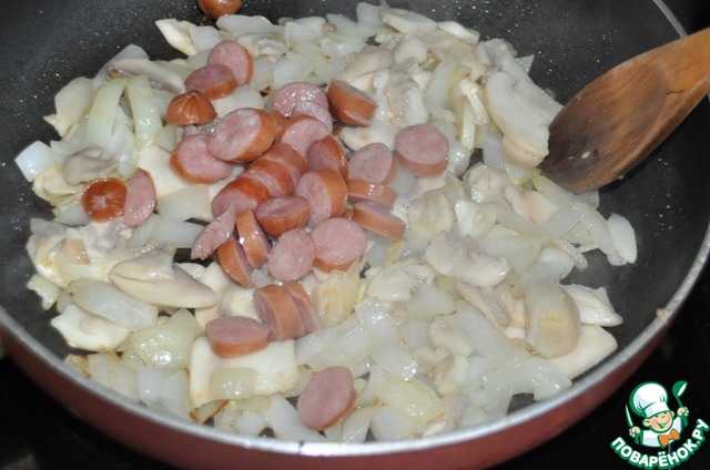 Кладём порезанные колечками охотничьи колбаски.