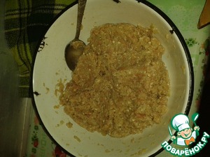 • Если у вас готовый фарш из магазина, то фарш разморозить, лук мелко нарезать, сыр потереть на терке, все хорошо перемешать. Я фарш делала сама, поэтому лук и сыр вместе с мясом пропустила через мясорубку.