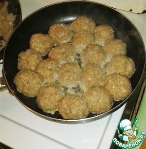 • Из фарша формируем небольшие шарики (обычно у меня получается штук 12-15) и выкладываем на раскаленную сковороду, смазанную растительным маслом. Убавляем огонь до среднего и обжариваем ежики с обеих сторон.
