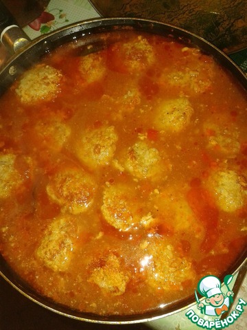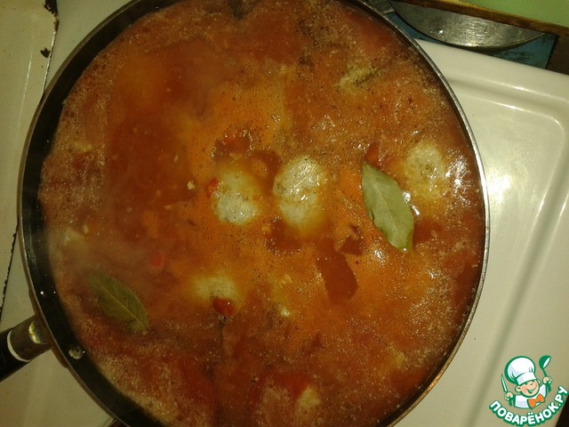 • Болгарский перец мелко нарезать, отправить на сковороду к ёжикам, томат развести в стакане горячей воды. Когда ёжики обжарятся залить их томатом, долить нужное количество воды (чтоб практически полностью покрывала ёжики), немного посолить, поперчить, положить лавровый лист. Закрыть крышкой и готовить на среднем огне 30 мин.