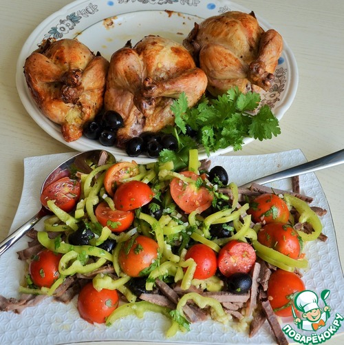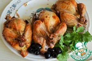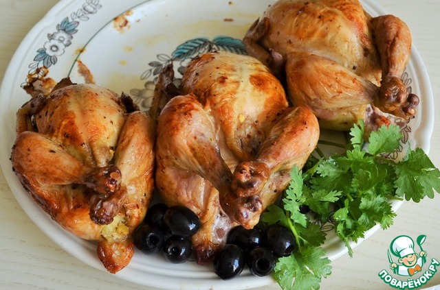 • Запекать цыплят при 200 градусах, 40 - 45 минут, до красивого румянца. В процессе дважды смазать соком, выделившимся при жарке. Удобнее делать это кисточкой. Выложить готовых цыплят на блюдо.