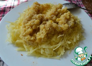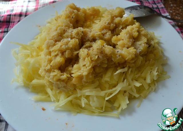 • Приготовить начинку. Заранее отварить желтую чечевицу, картофель сырой натереть на крупной терке. Смешать, посолить.