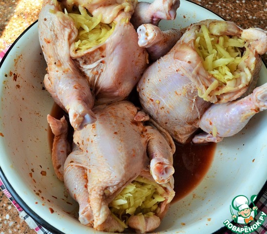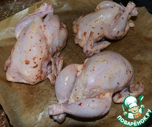 • Цыплят вымыть, обсушить, замариновать в аджике. Мариновать от 1 до 12 часов.