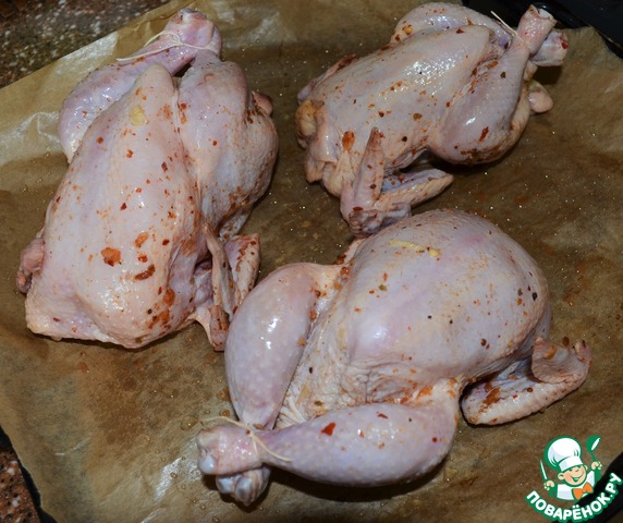 • Закрыть и закрепить зубочистками, ножки связать. Смешать растительное масло и 1 ст. л. маринада ( от цыплят), этой смесью обмазать цыплят. Выложить на бумагу для выпечки и на противень.
