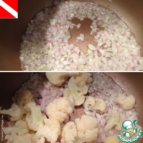 • Лук и чеснок мелко нарезать, в мультиварку налить немного растительного масла, обжарить лук и чеснок до прозрачности, затем добавить цветную капусту