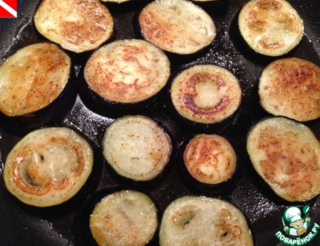 • На сковороде разогреть растительное масло и обжарить баклажаны с обеих сторон.