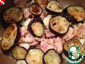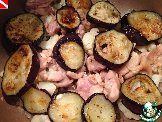 • На дно мультиварки, на обжаренный лук и цветную капусту выкладываем курицу, баклажаны.