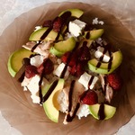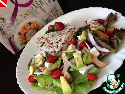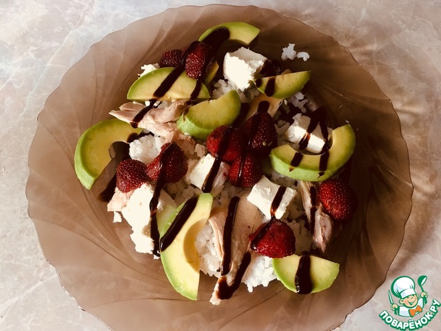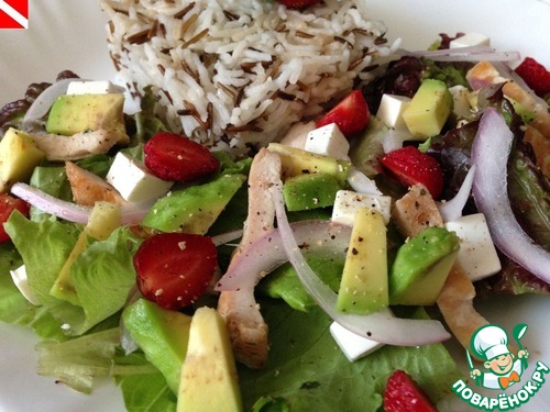 Листья салата порвать, сверху выложить куриное филе, нарезанное авокадо и фету, замаринованный лук и ягоды клубники.