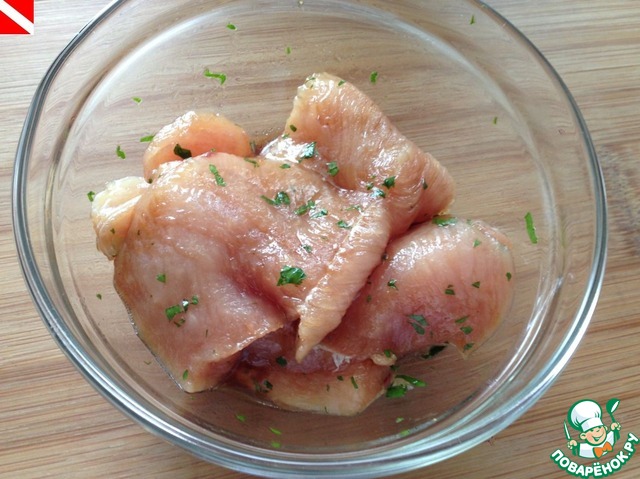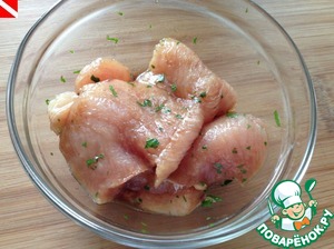 Куриное филе нарезать тонкими пластинками и опустить в маринад.