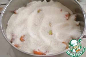 3) Так чередуем оставшиеся фрукты. Последний слой - сахар. Оставляем на 2 часа.