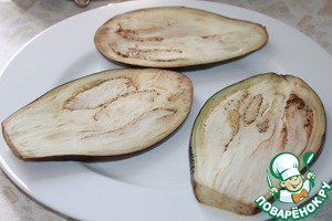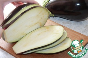 Баклажаны нарезать продольными слайсами, толщиной не более 1 см.